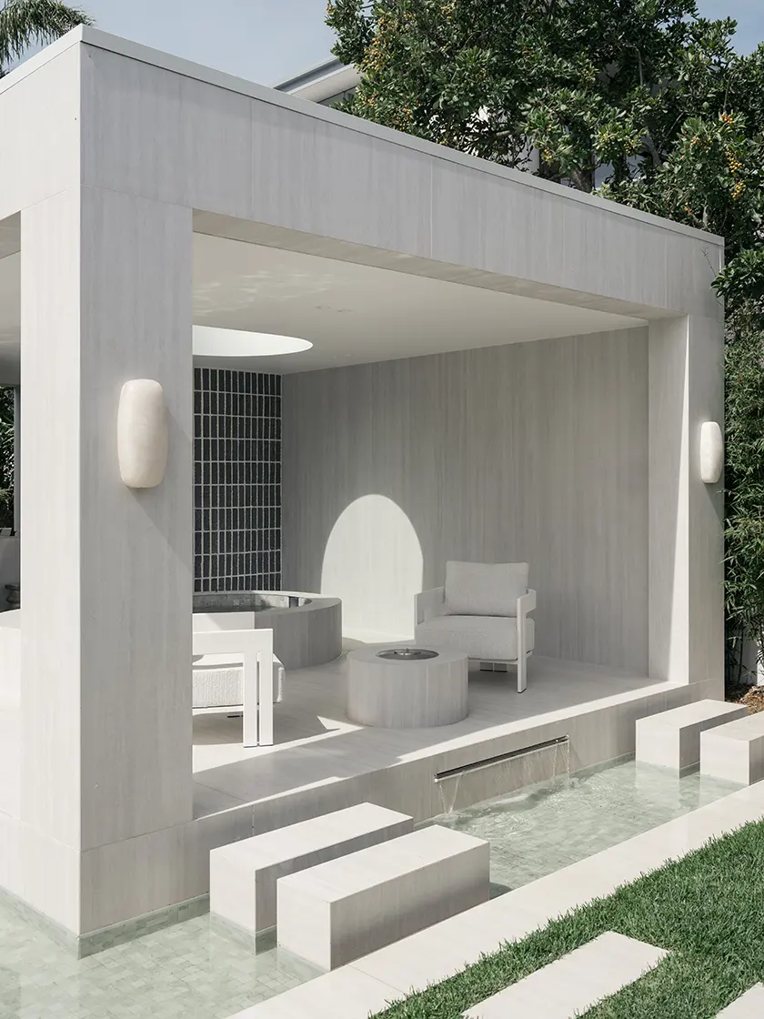 Private spaces are designed as calm retreats, unified by consistent material language and thoughtful detailing. A central pool and surrounding garden pavilion act as visual and spatial anchors, linking the interiors to the landscape and reinforcing the project’s focus on wellbeing, light and ease of living.